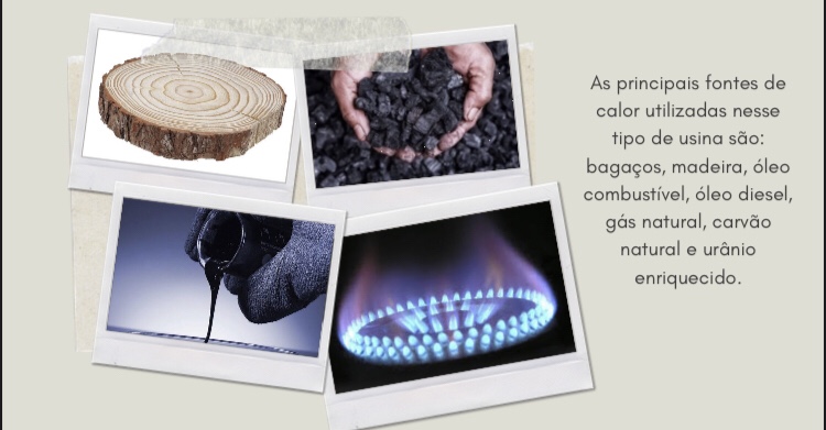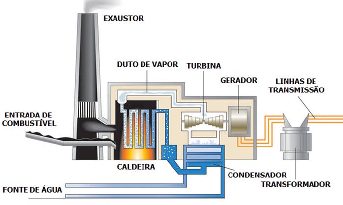 Basicamente, nas termelétricas, a caldeira é aquecida com água e produz vapor, o qual, em alta pressão, move as pás da turbina do gerador. Após ter movimentado as turbinas, o vapor é conduzido a um condensador onde será resfriado para reutilização em um novo ciclo.